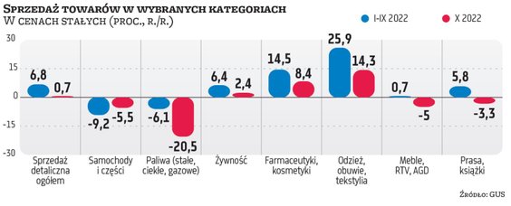 Szacunki ekonomistów uwzględniały to, że dynamikę sprzedaży w ujęciu rok do roku wspiera od lutego znaczący wzrost populacji Polski związany z napływem uchodźców z Ukrainy. W poprzednich dwóch miesiącach sprzedaż – po oczyszczeniu z wpływu czynników sezonowych – solidnie rosła jednak także w ujęciu miesiąc do miesiąca, czego nie dało się wyjaśnić zmianami populacji. W październiku jednak tak liczona sprzedaż tąpnęła o 1,3 proc., najbardziej od czerwca. – W pierwszej połowie roku konsumpcja była finansowana przez zmniejszenie stopy oszczędności, ale ta spadła już prawie do zera i nie ma już miejsca na dalszy ruch w dół – zauważyli ekonomiści z Santander Bank Polska.