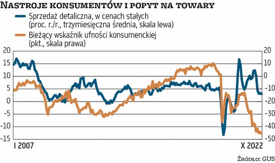Do zakupów Polaków zniechęca najwyższa od ponad ćwierćwiecza inflacja. Z jednej strony eroduje ona siłę nabywczą dochodów, z drugiej zaś wpływa negatywnie na nastroje gospodarstw domowych i ich skłonność do konsumpcji. W październiku przeciętne wynagrodzenie w sektorze przedsiębiorstw wzrosło o 13 proc. rok do roku, co oznacza, że w ujęciu realnym zmalało o niemal 5 proc., najbardziej od co najmniej 1997 r. Fundusz płac – miara wynagrodzeń ogółu pracujących w sektorze przedsiębiorstw – zmalał w mniejszym stopniu, o 2 proc. rok do roku. Pomijając kilka miesięcy pandemicznego 2020 r., to najgorszy wynik od 2010 r. A pewność zatrudnienia wśród konsumentów w ostatnich miesiącach malała, co tłumi skłonność do konsumpcji niezależnie od tego, jak faktycznie zmienia się sytuacja na rynku pracy.