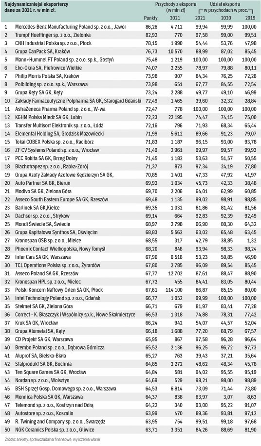 Łączne przychody z eksportu 50 największych firm z zestawienia, czyli wspomniane blisko 415 mld zł, są o ponad 41 proc. wyższe niż w 2020 r. i o 36,4 proc. wyższe niż w 2019 r. Bez wątpienia wzrost dynamiki eksportu związany jest z wcześniejszymi lockdownami z powodu pandemii wprowadzonymi w większości państw. Co oznacza, że dynamika jest liczona do niskiej podstawy z 2020 r.