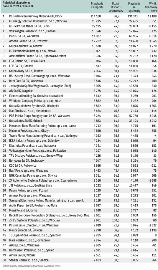 Niekwestionowanym liderem zestawienia największych eksporterów jest PKN Orlen. Grupa działa na rynku polskim, litewskim, czeskim, słowackim, niemieckim i kanadyjskim. W 2021 r. przychody Orlenu wyniosły 131 mld zł, z czego 114 mld zł stanowiły przychody z eksportu.