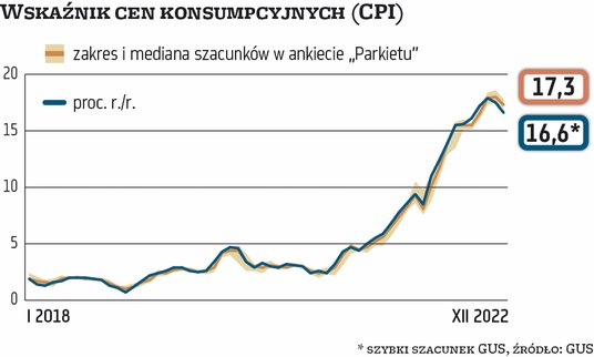 Wskaźnik cen konsumpcyjnych (CPI), główna miara inflacji w Polsce, wzrósł w grudniu o 16,6 proc. rok do roku, najmniej od sierpnia, po zwyżce o 17,5 proc. w listopadzie – oszacował wstępnie GUS. To wynik wyraźnie poniżej oczekiwań największych nawet optymistów w ankiecie „Parkietu”. Przeciętnie ekonomiści szacowali, że inflacja w grudniu zwolniła do 17,3 proc. rok do roku.