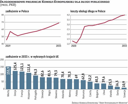 Skąd ta zmiana? W dużej części to wynik zmiany otoczenia makroekonomicznego w związku z pandemią, wybuchem wojny, kryzysem energetycznym i eksplozją inflacji itp. W efekcie na świecie skończyła się era „zerowych” stóp procentowych, weszliśmy w erę rosnących kosztów pożyczania. W Polsce to szczególnie bolesne – według założeń Komisji Europejskiej stopy procentowe na rynku długu pozostaną w horyzoncie 10 lat na poziomie ok. 6 proc. W ślad za tym rosnąć miałyby koszty obsługi zadłużenia – z 1,1 proc. PKB w 2021 r. do nawet 4 proc. PKB w 2033 r.