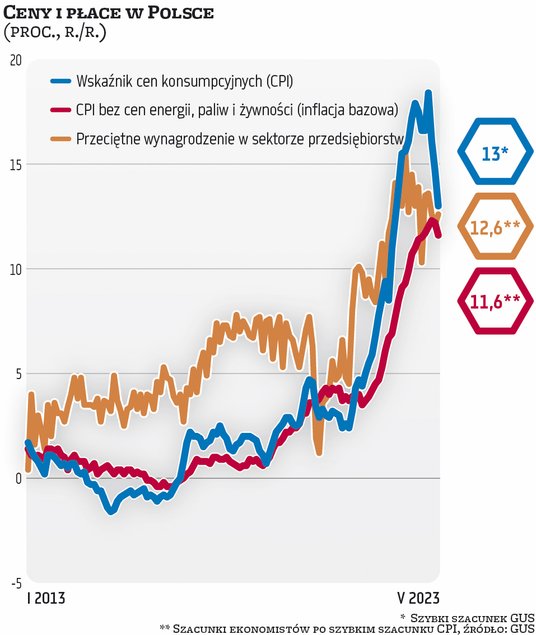 Wskaźnik cen konsumpcyjnych (CPI), główna miara inflacji w Polsce, wzrósł w maju o 13 proc. rok do roku, po zwyżce o 14,7 proc. w kwietniu – oszacował wstępnie GUS. Po raz ostatni inflacja była niższa w kwietniu ub.r. Co ważniejsze, w maju wyraźnie zmalała też inflacja bazowa, nieobejmująca cen energii, paliw i żywności. Jak oceniają obecnie ekonomiści, wyniosła od 11,3 do 11,7 proc. w porównaniu z 12,2 proc. w kwietniu. To sugeruje, że dezinflacja ma coraz szerszy zasięg.