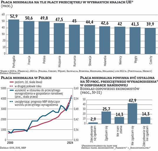 Obecnie zmiany płacy minimalnej są uzależnione m.in. od prognoz inflacji, błędów tych prognoz z przeszłości oraz wzrostu gospodarczego. W praktyce jednak rząd, który wysuwa pierwszą propozycję zmiany minimalnego wynagrodzenia w kolejnym roku, ma w tej kwestii sporą swobodę (skorzystał z niej w 2023 r., w 2024 r. podwyżka będzie niewiele większa od najmniejszej, na jaką pozwala ustawa). Efekt jest taki, że w tym i w przyszłym roku najniższe wynagrodzenie w Polsce (za pracę na pełny etat) podskoczy łącznie o 43 proc. W II połowie przyszłego roku znajdzie się w rezultacie na poziomie 54–55 proc. przeciętnego wynagrodzenia w gospodarce narodowej. Ten wskaźnik (zwany w ekonomii wskaźnikiem Kaitza) jeszcze nigdy nie był w Polsce na takim poziomie. Od 2000 r. tylko raz, w 2020 r., sięgnął 50 proc., tyle samo wyniesie prawdopodobnie w tym roku, co zapewni Polsce miejsce wśród unijnych liderów.