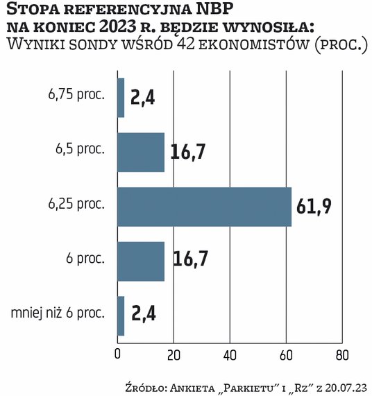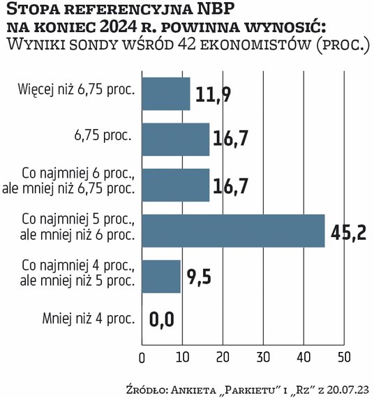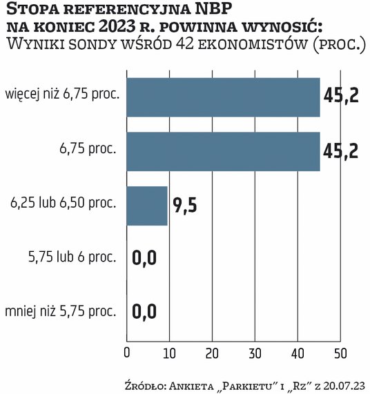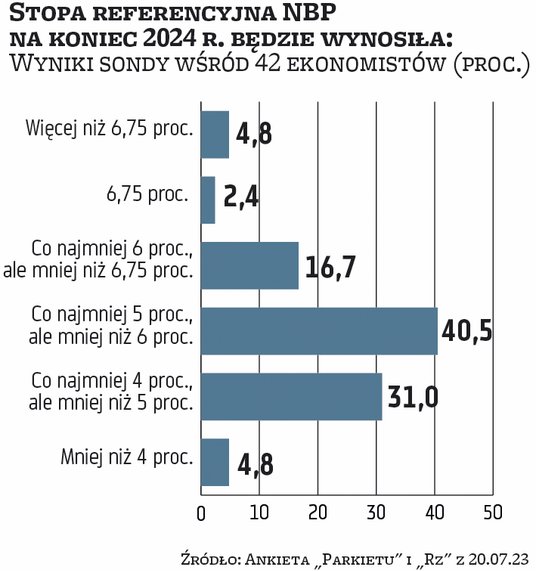 Ta zmiana rynkowych oczekiwań to pokłosie lipcowego posiedzenia RPP, a w szczególności konferencji prasowej prezesa NBP. Adam Glapiński ogłosił bowiem, że cykl podwyżek stóp procentowych, rozpoczęty w październiku 2021 r., został oficjalnie zakończony. W praktyce RPP po raz ostatni zmieniła stopy we wrześniu 2022 r., ale później sygnalizowała, że jest gotowa do ich dalszego podwyższania, gdyby pojawiła się taka konieczność. Zakończenie cyklu podwyżek to sygnał, jak tłumaczył prezes NBP, że kolejnym ruchem RPP będzie obniżka stóp. Pytany o to, kiedy można jej oczekiwać, nie wykluczył, że już we wrześniu. Powtórzył przy tym wskazane już w czerwcu warunki, które muszą być spełnione, aby RPP mogła poluzować politykę pieniężną. Po pierwsze, inflacja musi spaść poniżej 10 proc. Po drugie, dostępne w tym momencie prognozy muszą utwierdzać RPP w przekonaniu, że w kolejnych kwartałach wzrost cen konsumpcyjnych będzie nadal hamował. O ile jednak jeszcze w czerwcu ekonomiści oceniali na ogół, że te warunki zostaną spełnione najwcześniej w listopadzie, o tyle dziś wydaje się, że – w interpretacji prezesa NBP i większości członków RPP – może to nastąpić już we wrześniu albo w październiku.