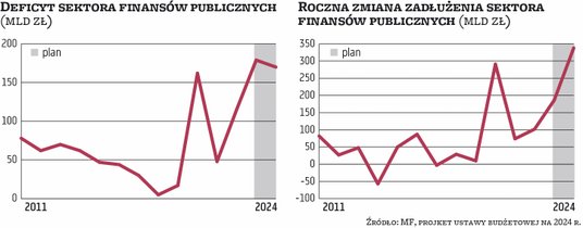 Po pierwsze, dług całego sektora finansów publicznych, liczony według metodologii UE, ma zwiększyć się o ok. 338 mld zł, do nieco ponad 2 bilionów zł, a dług publiczny liczony według polskiej definicji – o ok. 267 mld zł, do 1,57 bilionów zł. Różnica między tymi wskaźnikami sięgnąć ma 465 mld zł wobec 393 mld zł planu na 2023 r. – O kolejne 71 mld zł wzrośnie więc dług poza kontrolą parlamentu – komentuje Marcin Zieliński, prezes Fundacji FOR. – Przyrost zadłużenia finansów publicznych jest też zaskakująco wysoki, biorąc pod uwagę poziom deficytu w sektorze – zauważa Grzegorz Ogonek, ekonomista Santander BP. W ujęciu nominalnym dług ma się zwiększyć o wspomniane wyżej 338 mld zł, podczas gdy deficyt to ok. 170 mld zł.