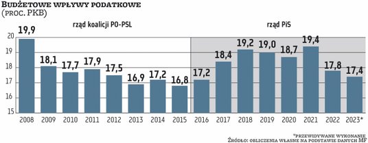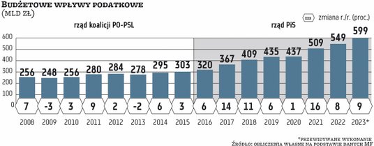 Jeśli chodzi o nominalne kwoty, to wydaje się, że nie jest źle, a nawet, że jest bardzo dobrze. Tylko w tym roku dochody podatkowe (tj. z VAT, z PIT i CIT razem z częścią dla samorządów, akcyzy, podatku od gier, bankowego, od kopalin i od sprzedaży detalicznej) mają wynieść ok. 600 mld zł. W porównaniu z 2015 r., czyli ostatnim rokiem rządów koalicji PO-PSL, będą więc niemal dwa razy, czyli o blisko 300 mld zł, wyższe.