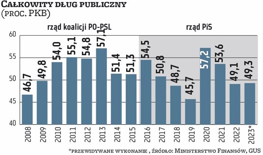 Na koniec 2023 r. dług Polski ma wynieść 49,3 proc. PKB, co zdaniem polityków PiS ma dowodzić, że finanse publiczne są w dobrej kondycji. Zwłaszcza na tle innych krajów Unii Europejskiej. Według prognoz Komisji Europejskiej (szacuje nieco wyższy wskaźnik – 50,1 proc. PKB) w tym roku aż 15 krajów ma zanotować wyższe zadłużenie niż Polska (w tym takich państwach jak Belgia, Portugalia, Francja i Hiszpania ma przekroczyć 100 proc. PKB, a we Włoszech i Grecji wynieść odpowiednio nawet 140 i 160 proc. PKB). Z kolei niższe zadłużenia ma być w 11 krajach, a najniższe – w Estonii – ledwie 19,5 proc. PKB.