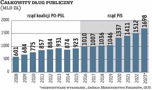 Który rząd zadłużył Polskę najbardziej? Z naszej przedwyborczej analizy jasno wynika, że liderem pod względem nominalnych liczb jest rząd PiS. W 2023 r. dług publiczny ma wynosić bowiem niemal 1,7 bln zł, a więc aż ok. 770 mld zł więcej niż osiem lat wcześniej. Za to za rządów koalicji PO–PSL przyrost ten wyniósł ok. 340 mld zł (z ok. 0,53 bln zł na koniec 2007 r. do 0,92 mln zł na koniec 2015 r.).