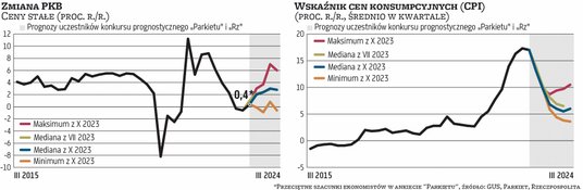 Ta zmiana przewidywań może dziwić, biorąc pod uwagę to, że we wrześniu i w październiku Rada Polityki Pieniężnej dokonała niespodziewanie dużych obniżek stóp procentowych. W lipcu ekonomiści spodziewali się w większości, że do końca br. RPP zdąży obniżyć stopę referencyjną tylko o 0,25 pkt proc., do 6,50 proc. Tymczasem już teraz wynosi ona 5,75 proc., a do końca roku – w świetle obecnych prognoz – zmaleje do 5,5 proc. To rozluźnienie polityki pieniężnej w II połowie 2024 r. powinno już wyraźnie oddziaływać na gospodarkę, prowadząc raczej do wyższych prognoz inflacji. W przeciwnym kierunku działała jednak jak dotąd sytuacja na globalnym rynku surowców. Dodatkowo, o ile w lipcu ekonomiści powszechnie zakładali, że z początkiem 2024 r. rząd wycofa się z mrożenia cen energii i obniżonej czasowo stawki VAT na podstawowe artykuły żywnościowe. Obecnie część analityków ocenia, że te elementy tzw. tarczy antyinflacyjnej zostaną utrzymane dłużej, być może do końca 2024 r. To założenie stoi na przykład za prognozami zespołu PKO BP, które przywołał na ostatniej konferencji prasowej prezes NBP Adam Glapiński. Analitycy z PKO BP sądzą, że w II kwartale przyszłego roku inflacja wyniesie 3,8 proc. rok do roku, czyli znajdzie się niewiele powyżej górnej granicy pasma dopuszczalnych odchyleń od celu NBP (2,5 proc. +/-1 pkt proc.). Później jednak zacznie znów przyspieszać, a w 2025 r. ujawni się „nawis inflacyjny” związany z obniżonym VAT-em i mrożeniem cen energii. „Chociaż w krótkim terminie widzimy kontynuację wyraźnej dezinflacji, to w dłuższej perspektywie oczekujemy, że trend dezinflacyjny zatrzyma się i inflacja utrzyma się na poziomie ok. 4 proc.” – napisali ekonomiści z PKO BP w ostatnim kwartalniku.