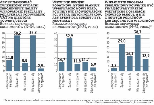 To szerokie poparcie dla wzmacniania potencjału obronnego Polski, na które wskazują też inne badania opinii, prowokuje pytanie, czy obywatele zaakceptowaliby podwyżkę podatków, z której wpływy pozwoliłyby na realizację tego celu. Z naszej sondy wśród uczestników panelu ekonomistów „Parkietu” i „Rzeczpospolitej” wynika bowiem, że taka forma finansowania wydatków zbrojeniowych uchodzi za wartą analizy. – Podwyższone wydatki na zbrojenia mają charakter permanentny (w związku z wysoką stopą amortyzacji sprzętu). Potrzebny jest podatek, który zbierałby ok. 1 proc. PKB dodatkowych przychodów na armię – tłumaczy dr Maciej Bukowski, ekonomista z WNE UW, prezes think tanku WiseEuropa. Dlaczego akurat 1 proc. PKB? Bo o tyle mniej więcej wzrosną trwale nakłady na zbrojenia.