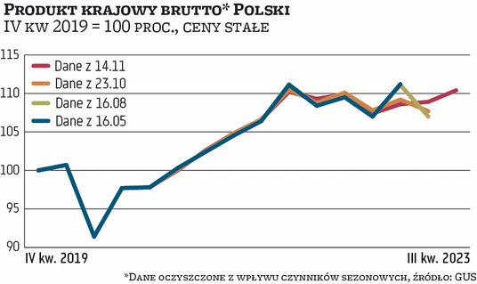 Gdyby pominąć te zaburzenia, dołek spowolnienia gospodarczego Polska ma już dawno za sobą. W świetle aktualnych danych przypadł na IV kwartał 2022 r. Z danych GUS wynika, że od tego czasu aktywność w gospodarce systematycznie rośnie i łącznie zwiększyła się o około 2,8 proc. W samym III kwartale oczyszczony z wpływu czynników sezonowych PKB zwiększył się o 1,4 proc. (w stosunku do I kwartału).