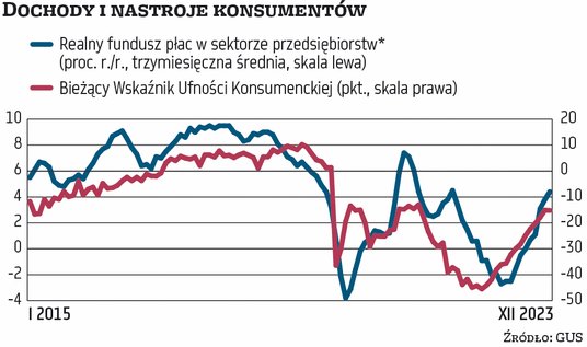 Na wzrost całkowitych dochodów z pracy negatywnie wpływa stagnacja zatrudnienia. W grudniu liczba etatów w sektorze przedsiębiorstw zmalała o 0,1 proc. rok do roku, po zniżce o 0,2 proc. w listopadzie. To jednak w dużej mierze efekt niedoboru rąk do pracy z powodów demograficznych, a nie słabego popytu na pracowników. Świadczy o tym wzrost poczucia pewności zatrudnienia, który – obok wzrostu siły nabywczej wynagrodzeń – przyczynia się do systematycznej poprawy nastrojów konsumentów. W styczniu, jak podał w piątek GUS, były one najlepsze od marca 2020 r.GS