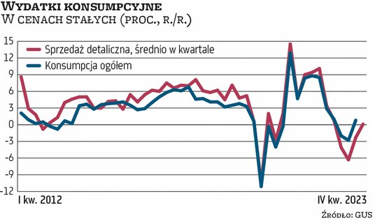 Negatywny wydźwięk grudniowych danych potęguje to, że sprzedaż detaliczna oczyszczona z wpływu czynników sezonowych mocno zmalała także w stosunku do poprzedniego miesiąca: o 2,9 proc., najbardziej od lutego 2023 r., po zniżce o 0,8 proc. w listopadzie. To sprawia, że zniżki sprzedaży rok do roku nie można już tłumaczyć wyłącznie wysoką bazą odniesienia z końca 2022 r., gdy popyt w Polsce był jeszcze podwyższony przez napływ uchodźców z Ukrainy. Przed listopadem w ciągu pięciu miesięcy odsezonowana sprzedaż podskoczyła o niemal 8 proc., co sugerowało, że zostawiając na boku efekty statystyczne, bieżący popyt konsumpcyjny odżywa.