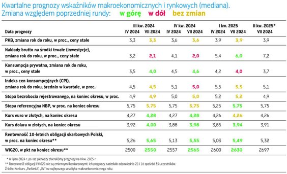 Takie prognozy dla inflacji mają ogromne znaczenie dla przewidywań ruchów stóp procentowych. Według naszej ankiety główna stopa NBP, referencyjna, pozostanie na poziomie 5,75 proc. aż do końca II kwartału 2025 r. Przy czym jeszcze w poprzedniej edycji konkursu (w kwietniu) oczekiwania rynkowe wskazywały na obniżki stóp już na początku przyszłego roku, a mediana prognoz na I kwartał wskazywała stopę wynoszącą 5,25 proc.