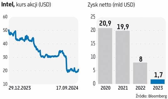 Akcje Intela straciły od początku roku do otwarcia wtorkowej sesji aż 56 proc. (W poniedziałek zyskały one jednak ponad 6 proc., co oznacza, że inwestorzy dobrze przyjęli plany zamrożenia części projektów). Koncern miał w I kwartale 437 mln USD straty netto, która w II kwartale powiększyła się do 1,6 mld USD. Intel Foundry, czyli dział koncernu zajmujący się produkcją chipów, stracił w I półroczu 5,3 mld USD, kiedy w 2023 r. stracił 7 mld USD. Intel tracił więc na produkcji mikroprocesorów, ale zyski z ich projektowania częściowo rekompensowały mu te straty. Marża operacyjna całego koncernu spada od 2021 r. i w II kwartale wyniosła 38,7 proc. Gelsinger zapowiadał w kwietniu, że w 2030 r. powinna ona jednak wynosić około 60 proc.