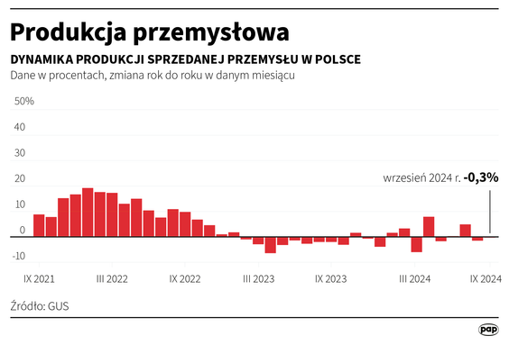 Konsensus prognoz ekonomistów, według ankiety „Rzeczpospolitej” i „Parkietu”, sugerował, że we wrześniu produkcja przemysłowa w Polsce urośnie o 0,3 proc. rok do roku. Rzeczywistość okazała się gorsza – odnotowano spadek w takiej skali. W dokładnie połowie z 34 działów przemysłu produkcja rok do roku urosła, najsilniej w wydobywaniu węgla kamiennego i brunatnego (o 21 proc.). W drugiej połowie branż odnotowano spadki, w tym najmocniejszy, o blisko 19 proc., w produkcji pozostałego sprzętu transportowego.