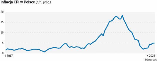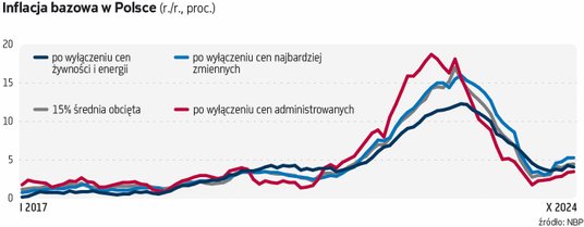 W poniedziałek NBP zameldował, że inflacja bazowa w październiku wyniosła 4,1 proc. rok do roku. Gwoli uściślenia, mowa o najpowszechniejszej mierze inflacji bazowej, tj. z wykluczeniem cen żywności (oraz napojów bezalkoholowych) i nośników energii (prądu, gazu, ciepłej wody, ogrzewania, opału, paliw). W ujęciu miesiąc do miesiąca inflacja bazowa w październiku wyniosła 0,4 proc. Ostatnio wyższy odczyt NBP zameldował w kwietniu. Odczyt 4,1 proc. rok do roku jest wprawdzie niższy niż we wrześniu (4,3 proc.), ale to efekt wysokiej bazy sprzed roku. Wydaje się, że do odczytów z czwórką z przodu powróciliśmy na dłużej. Wcześniej przez cztery miesiące (od maja do sierpnia) inflacja bazowa znajdowała się w przedziale 3,6–3,8 proc. Najnowsza projekcja inflacyjna NBP zakłada, że ta miara inflacji pozostanie na poziomie ponad 4 proc. (4,1–4,4 proc. średniokwartalnie) jeszcze w całym 2025 r. Zresztą odbiła w ostatnich miesiącach nie tylko ta główna miara inflacji bazowej, czyli bez cen energii i żywności. Po długim okresie spadków, od mniej więcej połowy roku, rośnie także inflacja bazowa w innych analizowanych aspektach: po wyłączeniu cen administrowanych (m.in. cen energii, gazu, kanalizacji, wody, wywozu śmieci), po wyłączeniu cen najbardziej zmiennych (zwykle m.in. paliw, gazu, opału, owoców, warzyw) oraz tzw. 15-procentowa obcięta (eliminuje wpływ 15 proc. koszyka cen o najmniejszej i największej dynamice). We wszystkich tych przypadkach roczna dynamika cen jest najwyższa od stycznia.