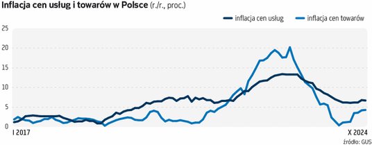 W piątek GUS potwierdził z kolei, że „pełna” inflacja CPI w Polsce wyniosła w październiku 5 proc., co było najwyższym odczytem w tym roku. Ton inflacji wciąż nadają ceny usług – w październiku były o 6,7 proc. wyższe niż przed rokiem. To widoczne w zasadzie w całej Europie zjawisko. Po pierwsze, wiążą się z wysokim wzrostem wynagrodzeń – koszty pracy w sektorze usług mają dużo większe znaczenie w strukturze kosztów.