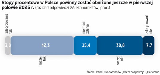 Stąd pytanie do polskich ekonomistów w kolejnej edycji Panelu Ekonomistów „Parkietu" i „Rzeczpospolitej”. Nasza teza brzmiała: „stopy procentowe w Polsce powinny zostać obniżone jeszcze w pierwszej połowie 2025 r.”. Zgodziło się z nią 12 z 26 ekspertów, przeciwnego zdania było dziesięć osób. Czworo ekonomistów nie ma zdania na ten temat. Jedną z nich jest prof. Małgorzata Zaleska, dyrektorka Instytutu Bankowości SGH. – Decyzja w sprawie wysokości stóp procentowych w pierwszej połowie roku będzie zależała od tego, jakie będą dane i prognozy po pierwszym kwartale – komentuje. Słowem: trzeba jeszcze poczekać. O tym, że wiele będzie zależeć od napływających danych w najbliższych miesiącach mówi też prof. Małgorzata Iwanicz-Drozdowska, kierownik Katedry Systemu Finansowego w Szkole Głównej Handlowej. Możliwą przestrzeń do obniżek, ale dopiero w drugiej połowie roku, widzi prof. Ryszard Rapacki, wieloletni nauczyciel z SGH. – W moim przekonaniu w pierwszym półroczu 2025 roku nie powstaną jeszcze warunki do obniżki stóp procentowych. W szczególności obniżce nie będzie sprzyjać przewidywane (przejściowe) przyspieszenie inflacji CPI oraz utrzymywanie się na wysokim poziomie (ponad 4 proc.) inflacji bazowej – komentuje.
