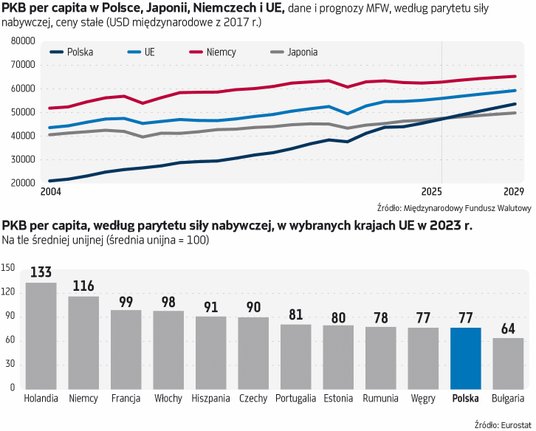 Czy Polska będzie drugą Japonią? Pod względem wytwarzanego PKB na osobę, liczonego według parytetu siły nabywczej (PPS; wyrównuje różnice w poziomie cen między gospodarkami) – już może nią być. Prognozy Międzynarodowego Funduszu Walutowego zakładają, że w 2025 r. polski PKB na osobę, liczony w tzw. dolarach międzynarodowych, ma sięgnąć 47,1 tys. wobec 47,5 tys. w Japonii. Jeśli dobrze pójdzie, Azjatów w tej statystyce dojdziemy już w tym roku, jeśli nie: za rok. Podobną drogę przechodzimy względem Unii Europejskiej. Z danych MFW wynika, że w 2004 r. byliśmy na poziomie 49 proc. średniej unijnej, w 2023 r. było to już 80 proc., a w 2024 r. 82 proc. Dość podobne dane publikuje Eurostat – z jego danych wynika, że w 2004 r. PKB na osobę według PPS było w Polsce na poziomie 52 proc. unijnej średniej, w 2023 r. było to 77 proc. Wstępne dane za 2024 r. powinniśmy poznać jeszcze w marcu, szacunki sugerują powrót w okolice 80 proc. średniej UE.