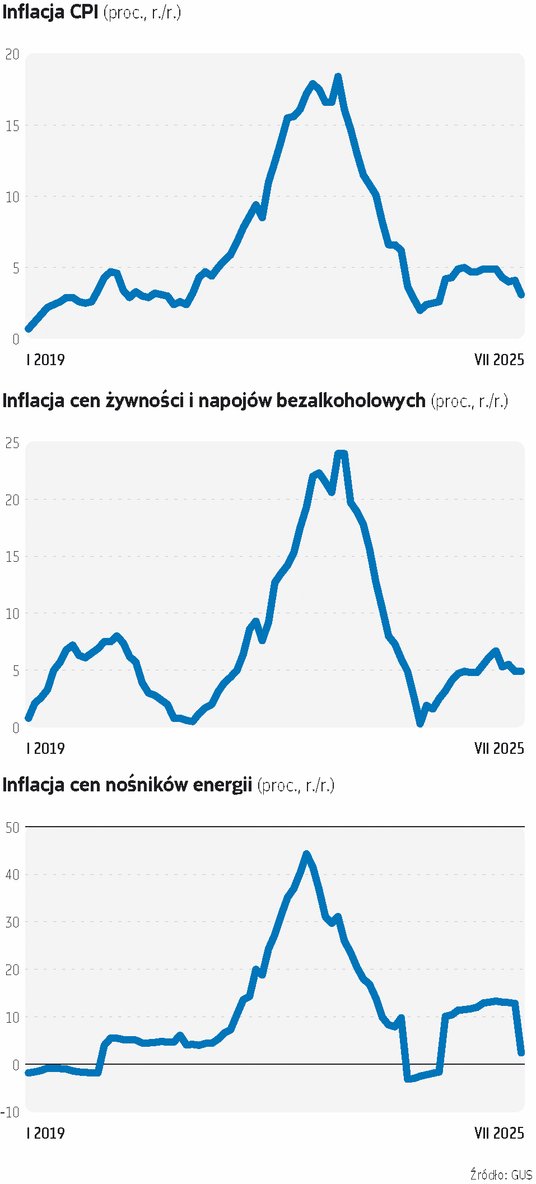 Z drugiej strony, wynik 3,1 proc. jest zdecydowanie niższy od czerwcowego (4,1 proc.) i w ogóle najniższy od czerwca 2024 r. To także pierwszy raz od tamtego czasu, gdy inflacja znalazła się w przedziale dopuszczalnych odchyleń od celu inflacyjnego NBP (2,5 proc. +/– 1 pkt proc.), po roku wahań w granicach 4–5 proc. r./r.