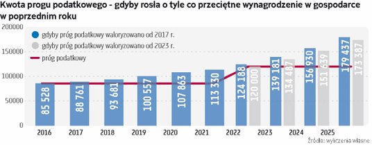 Ostatni raz próg podatkowy podniesiono w Polsce w 2022 r., z 85 528 zł do 120 tys. zł brutto. Był to element większej reformy, w ramach której w górę do 30 tys. zł poszła też kwota wolna od podatku, a potem także w dół wysokość dolnej stawki PIT z 17 do 12 proc. (aby ratować błędy Polskiego Ładu). Taka skala podwyżki kwoty drugiego progu mniej więcej odpowiadała tempu wzrostu przeciętnego wynagrodzenia w gospodarce narodowej w poprzednich sześciu latach (2016-2021).