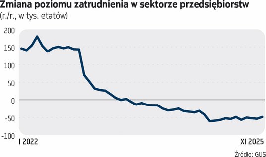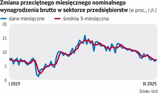 Dane za listopad są wprawdzie wyższe niż za październik (wówczas +6,6 proc. r/r), ale drugie najniższe po nich od blisko pięciu lat. Nie odwołują zdecydowanie wniosku, że dynamika wynagrodzeń w firmach w Polsce (i generalnie szerzej: w gospodarce) hamuje. Dzieje się tak z kilku przyczyn. Po pierwsze, wyraźnie zmieniła się sytuacja na rynku pracy: obniżył się popyt na pracę, a przedsiębiorstwa nie są już tak skore do podwyżek, szczególnie sutych. Zresztą spadek inflacji sprawił, że i żądania płacowe pracowników są mniejsze. Dane NBP wskazują, że presję płacową zgłaszało w trzecim kwartale 61,5 proc. firm, a jej nasilenie 9,5 proc. To najniższe odczyty od blisko pięciu lat. Bardzo ważnym czynnikiem obniżającym tempo wzrostu płac w firmach są też niższe podwyżki płacy minimalnej – obecnie jest ona o 8,5 proc. wyższa niż przed rokiem, w poprzednich dwóch latach notowano dynamiki w okolicach 20 proc. rocznie. W 2026 r. płaca minimalna urośnie tylko o 3 proc.