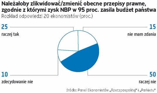 W związku z tym w Panelu Ekonomistów „Rzeczpospolitej”, w którym biorą udział naukowcy z uczelni i wydziałów ekonomicznych w Polsce, sformułowaliśmy zapewne kontrowersyjną myśl: być może czas przeciąć tę potencjalną formę zależności pomiędzy NBP a rządem? Nakreślając powyższy kontekst, poprosiliśmy ekonomistów o ocenę następującej tezy: „Należałoby zlikwidować lub zmienić obecne przepisy prawne, zgodnie z którymi zysk NBP w 95 proc. zasila budżet państwa”. Ekonomiści w większości jednak odrzucili tę konkluzję: przeciwnych jej okazało się dwanaścioro badanych (w tym dwoje zdecydowanie), zgodę wyraziło natomiast pięcioro. Troje stwierdziło, że nie ma zdania.