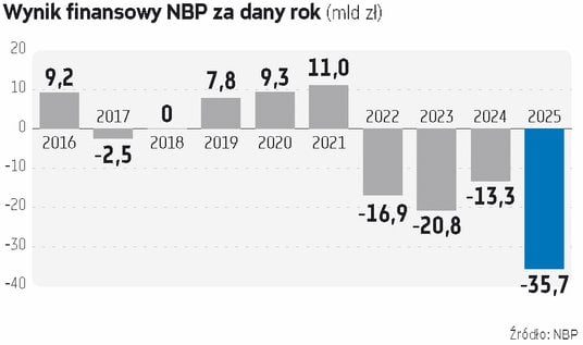 Zysk z NBP od kilku lat nie wspiera już budżetu kraju. Ostatni raz bank centralny zanotował bowiem zysk w 2021 r., co skutkowało przelewem do centralnej kasy blisko 10,5 mld zł w czerwcu 2022 r. Od tamtego czasu ma już co roku straty, wynikające głównie z kosztów absorpcji nadpłynności w sektorze bankowym (emisji bonów pieniężnych) oraz umocnienia złotego względem walut w rezerwach dewizowych. Prezes Glapiński poinformował, że w 2025 r. wynik finansowy banku centralnego wyniósł –35,7 mld zł, co znów będzie oznaczać okrągłe zero złotych wpłaty do budżetu.