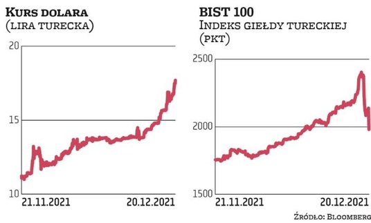Bank Centralny Republiki Turcji obciął w zeszły czwartek główną stopę procentową o 100 pkt baz., do 14 proc. Od września obniżył ją łącznie o 500 pkt baz., pomimo przyspieszającej inflacji konsumenckiej, która sięgnęła w listopadzie 21,3 proc. r./r. Luzuje on politykę pieniężną pod naciskiem prezydenta Erdogana, który jest wyznawcą teorii mówiącej, że wysokie stopy procentowe podsycają inflację. Bank centralny w ostatnich tygodniach kilkakrotnie interweniował na rynkach, by powstrzymać osłabienie liry, ale za każdym razem dawało to jedynie krótkotrwały efekt. Ta polityka wzbudziła już poważny sprzeciw tureckich środowisk biznesowych.