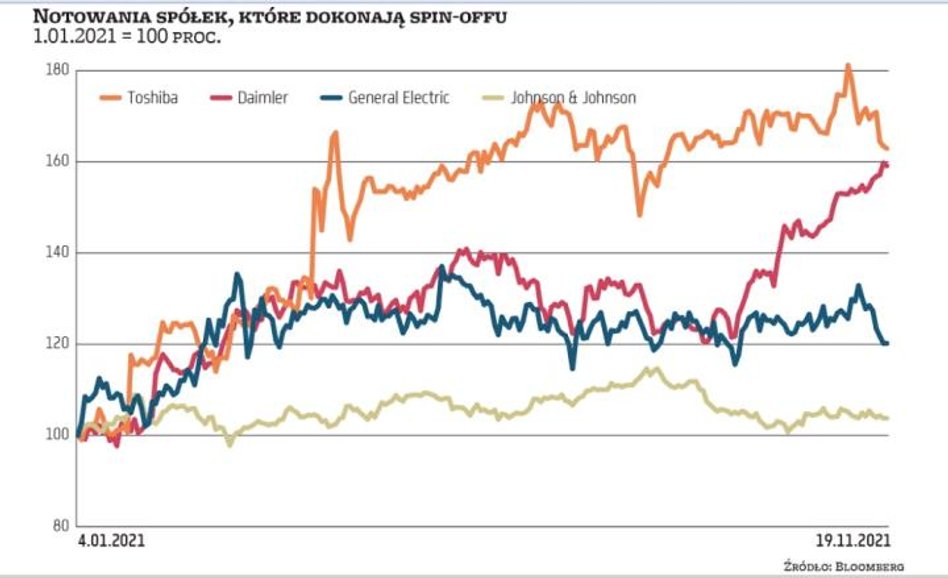 Na zagranicznych parkietach widać trend w zakresie podziału dużych korporacji na mniejsze firmy. Zdaniem analityków takie działania przynoszą często pozytywne skutki. W przyszłości można spodziewać się więcej tego typu transakcji. Kwestią czasu jest również pojawienie się takich działań na polskim rynku.