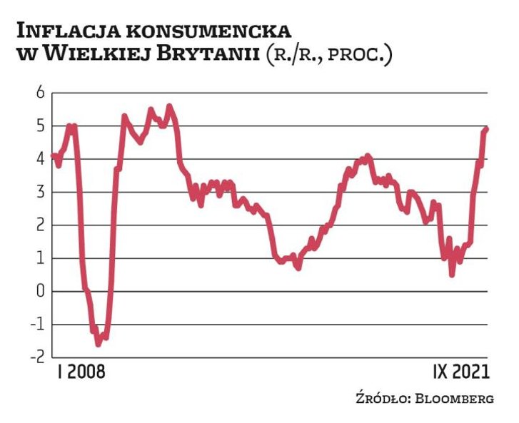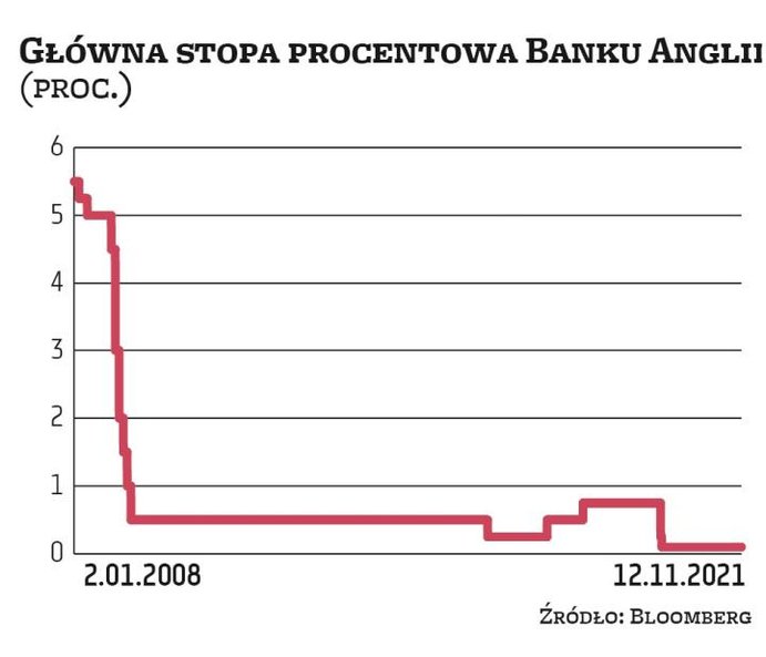Analitycy Goldman Sachs twierdzą, że podwyżki stóp procentowych w Wielkiej Brytanii zostały jedynie lekko opóźnione. Pierwszej z nich można się spodziewać najwcześniej w grudniu, a najpóźniej w lutym, i może ona sięgnąć 15 pkt baz. Do kolejnej może natomiast dojść w maju i prawdopodobnie wyniesie ona 25 pkt baz. Są też prognozy przewidujące, że Bank Anglii będzie mocniej zacieśniał politykę pieniężną. Analitycy RBC Capital Markets spodziewają się, że na koniec roku jego główna stopa procentowa będzie wynosiła 0,35 proc. Mediana prognoz na końcówkę 2022 r. (zebranych przez agencję Bloomberga) mówi już o 0,5 proc., a najbardziej „jastrzębia" spośród nich (opracowana przez naukowców z Uniwersytetu Cardiff) aż o 2 proc. Siedem prognoz wskazuje jednak, że na koniec przyszłego roku stopy nadal będą na obecnym poziomie 0,1 proc.
