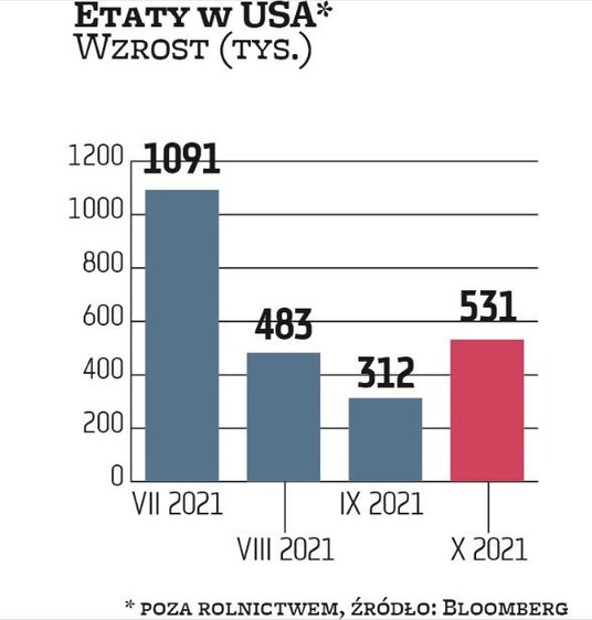 Stopa bezrobocia w USA zmniejszyła się z 4,8 proc. we wrześniu do 4,6 proc. w październiku. Przeciętnie oczekiwano jej spadku do 4,6 proc. Inny miernik bezrobocia, uwzględniający osoby zniechęcone do aktywnego szukania pracy oraz ludzi zatrudnionych z przyczyn ekonomicznych w niepełnym wymiarze godzin, spadła z 8,5 proc. do 8,3 proc. Przed pandemią wynosiła 7 proc. Stopa uczestnictwa w rynku pracy utrzymała się na poziomie 61,6 proc. i była o 1,7 pkt proc. niższa niż przed pandemią. Oznacza to, że do siły roboczej jest zaliczanych prawie o 3 mln Amerykanów mniej niż w lutym 2020 r.