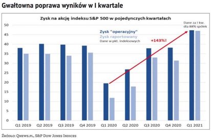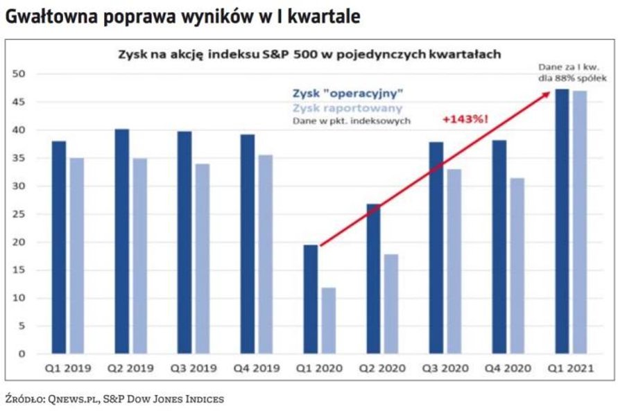 Całościowy obraz najnowszych osiągnięć finansowych wygląda imponująco. Wstępne dane pokazują, że zagregowany zysk raportowany w I kwartale był o... prawie 300 proc. większy niż w analogicznym kwartale 2020 r., zaś z natury bardziej stabilny zysk „operacyjny" (oczyszczony z jednorazowych zdarzeń) – większy o ponad 140 proc. (na zysku operacyjnym koncentrują się nasze dalsze rozważania).