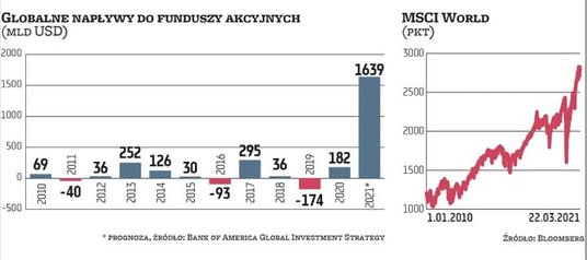 Obawy o inflację powodują, że inwestorzy na całym świecie nie chcą trzymać gotówki. W efekcie pompują kapitał na rynek akcji. Analitycy Bank of America wyliczyli, że jeśli globalne napływy do funduszy akcji będą utrzymywać się na dotychczasowym poziomie, w tym roku mogą sięgnąć astronomicznych 1,6 bln USD.