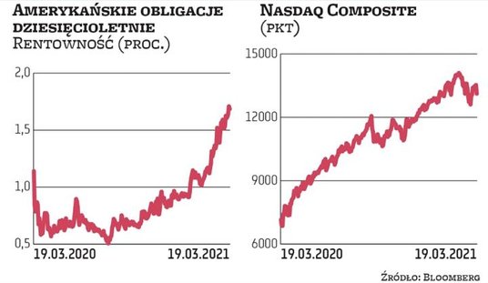Rentowność amerykańskich obligacji dziesięcioletnich lekko rosła w piątek po południu, po tym jak dzień wcześniej sięgnęła poziomu 1,7 proc. Jej skok, wywołany przeświadczeniem inwestorów, że Fed dopuści do inflacji wyższej od celu, był impulsem do czwartkowego spadku indeksu Nasdaq Composite aż o 3,1 proc. Piątkową sesję indeks także zaczął na minusie.