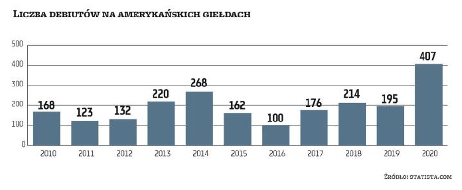Możliwe, że w tym roku również europejski rynek IPO odżyje. Z danych PwC wynika, że w 2020 r. w Europie wartość ofert sięgnęła 20,3 mld euro, co oznacza spadek o 8 proc. Początek roku jednak daje nadzieję na przełom. W Amsterdamie zadebiutował InPost, którego wartość oferty wyniosła 2,8 mld euro. W Londynie zadebiutowała marka obuwnicza Dr. Martens pozyskując 1,3 mld funtów. W kolejce stoi również platforma handlu używanymi samochodami Auto1. Spółka chce zadebiutować na niemieckiej giełdzie, a wartość oferty może sięgnąć około 1 mld euro. Z nieoficjalnych informacji wynika, że w kwietniu na giełdzie zadebiutować może brytyjska firma dostarczająca jedzenie Deliveroo. W czasie pandemii mocno wzrósł popyt na tego typu usługi, przez co biznes Deliveroo rozkwitł. Podczas ostatniej prywatnej rundy finansowania spółka została wyceniona na 7 mld USD, a według szacunków debiut giełdowy mógłby ją wycenić na około 13 mld USD.