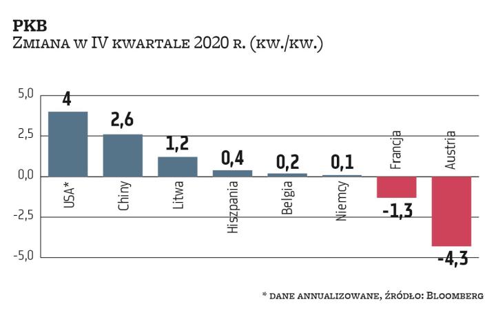 – Potwierdzenie, że Niemcy uniknęły spadku PKB w IV kwartale, jest niewielkim pocieszeniem, jeśli weźmiemy pod uwagę, że niemal pewny jest jego spadek w I kwartale. O ile silne ożywienie jest prawdopodobne w dalszej części roku, o tyle powolne postępy programu szczepień oznaczają, że odbicie będzie przebiegało wolniej, niż się spodziewaliśmy – twierdzi Andrew Kenningham, ekonomista z firmy badawczej Capital Economics.