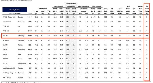 Średni dług netto według Goldman Sachs wynosi 1,15-krotność kapitału własnego. To dwa razy więcej niż w firmach brytyjskich. Na drugim miejscu są ex aequo spółki z włoskiego MIB30 i hiszpańskiego IBEX35, dla których wskaźnik wynosi 0,97.Niemieckie firmy popadają w długi wraz z każdym dniem kolejnego lockdownu.