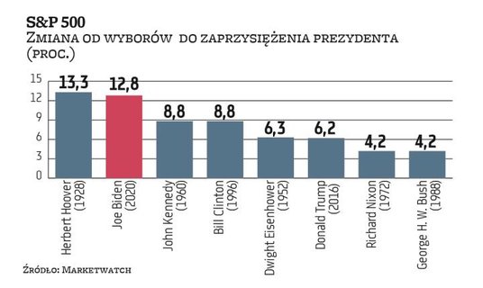 Amerykański indeks S&P 500 zyskał od wyborów prezydenckich do dnia zaprzysiężenia Joe Bidena na prezydenta USA aż 12,8 proc. Mocniej urósł tylko w okresie pomiędzy wyborami i zaprzysiężeniem Herberta Hoovera, na przełomie 1932 i 1933 r. (Miał wówczas jednak więcej czasu na zwyżki, gdyż zaprzysiężenie prezydenta do 1937 r. odbywało się 4 marca, a dopiero od 1941 r. dochodzi do niego 20 stycznia.) Po wyborze w 2016 r. Donalda Trumpa zwyżka S&P 500 do dnia inauguracji prezydentury sięgnęła 6,2 proc. Po wyborze Baracka Obamy na drugą kadencję wyniosła 4 proc., po pierwszej jego wygranej indeks stracił 19,9 proc.