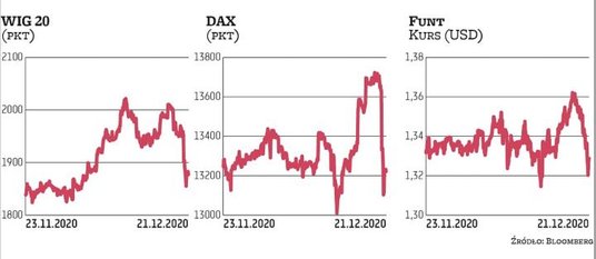 Strach przed nowym szczepem koronawirusa wykrytym w Wielkiej Brytanii mocno uderzył w rynki. WIG20 tracił w trakcie poniedziałkowej sesji nawet prawie 4,5 proc. (po południu tempo przeceny nieco wyhamowało i koło godziny 16 spadek tego indeksu wynosił 2,7 proc.). Niemiecki DAX i francuski CAC 40 traciły późnym popołudniem blisko 3 proc., hiszpański Ibex 35 ponad 3 proc. a rosyjski RTS powyżej 4 proc. Brytyjski FTSE 100 zniżkował nieco mniej gwałtownie – tylko o 2,3 proc. Funt brytyjski tracił w ciągu sesji nawet 1,7 proc. do dolara, a kurs zniżkował do poziomu 1,32 USD za funta. Sesja w USA zaczęła się od spadków. S&P 500 tracił na jej początku 1,1 proc.