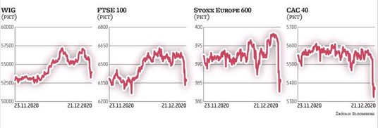 Doniesienia o nowym szczepie koronawirusa szybko rozprzestrzeniającym się w Wielkiej Brytanii popsuły nastroje inwestorom. WIG20 tracił w poniedziałek nawet prawie 4,5 proc. (ale tempo spadku wyhamowało i indeks zakończył dzień 3,26 proc. na minusie). Niemiecki DAX i francuski CAC 40 spadały o niemal 3 proc. Sesja w USA zaczęła się od umiarkowanych redukcji. Dow Jones Industrial na jej początku obniżył się tylko o 0,7 proc. Cena ropy gatunku WTI spadała w poniedziałek nawet o ponad 5 proc. Traciły też inne surowce. Kurs bitcoina zmniejszył się z 24 tys. USD do poniżej 22 tys. USD, by po południu odbić się w okolice 23 tys. USD.