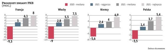 Mediana przewidywań analityków zebranych przez agencję Bloomberga mówi, że PKB Niemiec wzrośnie w 2021 r. o 4 proc., po spadku o 5,6 proc. w 2020 r. Najbardziej pesymistyczna prognoza mówi o 2,4-proc. wzroście w przyszłym roku, a najbardziej optymistyczna o 6,9-proc. Wszystkie z nich powstały w listopadzie lub w grudniu, już po pierwszych komunikatach o udanych testach szczepionek na Covid-19. Wciąż jednak daje o sobie znać niepewność co do wpływu pandemii na gospodarkę. Widać ją szczególnie w prognozach na pierwsze dwa kwartały 2021 r. Przewidywania dla PKB na pierwszy kwartał wahają się od minus 3,9 proc. r./r. do plus 1,8 proc., a na drugi od 9 proc. do 14,5 proc.