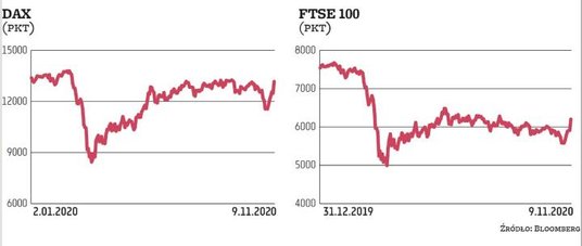 – Dzisiaj jest wielki dzień dla nauki i dla ludzkości. Pierwsza seria wyników testów trzeciej fazy naszej szczepionki zapewnia wstępnie dowody na jej zdolność zapobiegania Covid-19 – poinformował Albert Bourla, prezes koncernu Pfizer. Szczepionka tej firmy (opracowana wspólnie z niemiecką spółką BioNTech) okazała się skuteczna w 90 proc. Ta wiadomość wprawiła globalne rynki akcji w euforię. O ile sesja na giełdach europejskich zaczęła się od solidnych zwyżek, o tyle po godzinie 13 zmieniła się w eksplozję radości. Niemiecki indeks DAX zyskiwał późnym popołudniem 6 proc., brytyjski FTSE 100 5,5 proc., a francuski CAC 40 7,9 proc. Sesja w USA zaczęła się od silnych zwyżek. Dow Jones Industrial zyskiwał 5,2 proc. i ustanowił nowy rekord. Akcje Pfizera rosły na początku sesji w Nowym Jorku o 12 proc.