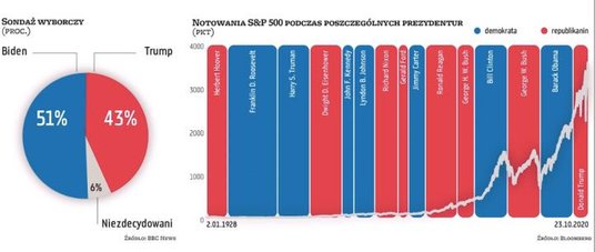 – Ocena kierunku zachowania rynków w zależności od wyboru kandydata nie jest oczywista. Pokazuje to, chociażby sytuacja z 2016 r. kiedy wybór Donalda Trumpa miał doprowadzić do załamania rynkowego. Ostatecznie S&P 500 po ustanowieniu lokalnych minimów w listopadzie rósł niemal nieprzerwanie do początku 2018 r., zyskując na wartości ponad 60 proc. W obecnych warunkach oprócz samego wyboru prezydenta ważne będą wybory do Senatu. Jeżeli republikanie utrzymają przewagę i jednocześnie wybory wygra Joe Biden, to na rynkach może zapanować większa niepewność, w obawie przed potencjalnym blokowaniem zwiększonych pakietów pomocowych – mówi Remigiusz Lemke, analityk DM mBanku. – Specjaliści wskazują też, że rynek przyzwyczaił się już do nieobliczalności Trumpa, a zachowanie Bidena nie jest oczywiste. „W przypadku zwycięstwa Trumpa nie widzimy ryzyk dotyczących rozwoju sytuacji na rynkach kapitałowych. Jest on dobrze znany pomimo specyficznego stylu sprawowania prezydentury, chociaż w dłuższym terminie zwiększa ryzyko eskalacji wojen handlowych oraz ryzyko braku kolejnych etapów wsparcia fiskalnego. W przypadku Bidena istnieją pewne ryzyka głównie po stronie możliwości cofnięcia reformy CIT i podwyżki podatków o około 10 pkt proc. – to może spowodować spadki na rynku oraz ryzyko spadków w segmencie technologicznym"– napisali w komentarzu eksperci z OPTI TFI.
