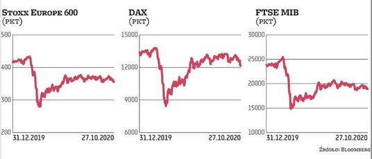 Na większości giełd europejskich kontynuowane były we wtorek spadki. W przypadku wielu z nich były one łagodniejsze niż w poniedziałek, a niektóre indeksy (np. przez pewien czas polski WIG i brytyjski FTSE 100) rosły. Na rynkach utrzymywała się jednak nerwowa atmosfera związana głównie z sytuacją epidemiczną w Europie. Pojawiły się przecieki mówiące, że w Niemczech zostanie wprowadzony „łagodny lockdown", podczas którego zamknięta będzie gastronomia (ale czynne będą m.in. szkoły). We Włoszech rząd zatwierdził ograniczenie pracy restauracji i barów do godz. 18. W Hiszpanii przedłużono stan nadzwyczajny aż do 9 maja. Restrykcje zostaną najprawdopodobniej też mocno zaostrzone we Francji i w Belgii.