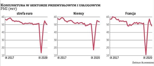 Jak podała w środę firma IHS Markit, zbiorczy PMI, obejmujący sektory przemysłowy i usługowy, spadł we wrześniu w strefie euro do 50,1 pkt z 51,9 pkt w sierpniu. Była to druga zniżka tego wskaźnika z rzędu, co sugeruje, że gwałtowne początkowo ożywienie po kryzysie wywołanym przez pandemię Covid-19 straciło impet. Ekonomiści spodziewali się wprawdzie kolejnej zniżki PMI, ale niewielkiej, do 51,7 pkt. Tymczasem wskaźnik ten znalazł się we wrześniu minimalnie powyżej granicy 50 pkt. To oznacza, że niemal tyle samo przedsiębiorstw dostrzega poprawę swojej sytuacji w porównaniu z poprzednim miesiącem, co jej pogorszenie. Dystans od granicy 50 pkt można interpretować jako miarę tempa wzrostu aktywności w gospodarce w ujęciu miesiąc do miesiąca. W tym świetle we wrześniu aktywność praktycznie stanęła w miejscu.