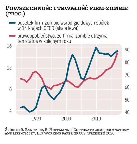 Co siódma giełdowa firma w krajach rozwiniętych była w 2017 r. „chodzącym trupem", czyli zombie. Tak określa się przedsiębiorstwa, które nie są w stanie zarobić na obsługę swoich zobowiązań, a na powierzchni utrzymują się dzięki dostępowi do taniego finansowania. W 2010 r., tuż po globalnym kryzysie finansowym, szeregi zombie były nieco większe. Zaliczała się do nich co szósta giełdowa spółka. Ten rekord wkrótce zostanie prawdopodobnie pobity. Od początku lat 80. populacja firm-zombie powiększała się bowiem po każdym kolejnym kryzysie, a w okresach dobrej koniunktury malała jedynie nieznacznie. Obecny kryzys, wywołany przez pandemię Covid-19, może być nawet skuteczniejszym inkubatorem zombie niż wcześniejsze. Większa jest bowiem determinacja rządów i banków centralnych, aby nie dopuścić do niepotrzebnych bankructw. Korzystają na tym przedsiębiorstwa, których upadłość byłaby przejawem zdrowej „kreatywnej destrukcji". A to – na dłuższą metę – może być hamulcem rozwoju gospodarczego. Czy zombifikacja gospodarki, zaobserwowana po raz pierwszy w Japonii w latach 90. XX w., stanie się też problemem Polski?