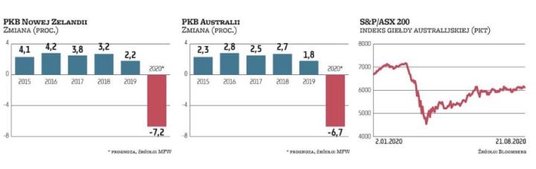 Co prawda dane o australijskim PKB za drugi kwartał poznamy dopiero na początku września, ale wszystko wskazuje na to, że kraj wpadł już w pierwszą recesję od 29 lat (PKB spadł w pierwszym kwartale o 0,3 proc. kw./kw., ale wzrósł o 1,4 proc. r./r.), a Bank Rezerw Australii prognozuje, że gospodarka skurczy się w tym roku o 4 proc., to oczywiście byłby lepszy wynik niż w przypadku większości państw Europy, ale i tak byłby to największy roczny spadek australijskiego PKB od co najmniej II wojny światowej. Międzynarodowy Fundusz Walutowy jest większym pesymistą i spodziewa się, że PKB Australii spadnie w tym roku o 6,7 proc., a Nowej Zelandii o 7,2 proc. (gdy np. PKB Polski ma spaść o 4,6 proc., a USA o 5,9 proc.). Spadki PKB w tych krajach to oczywiście nie tylko wina restrykcji związanych z pandemią. W gospodarkę Australii uderzyło w pierwszej połowie roku też pogorszenie koniunktury na globalnych rynkach surowcowych (ale ożywienie gospodarcze w Chinach zwiększa popyt na australijskie metale przemysłowe, węgiel oraz surowce rolne).